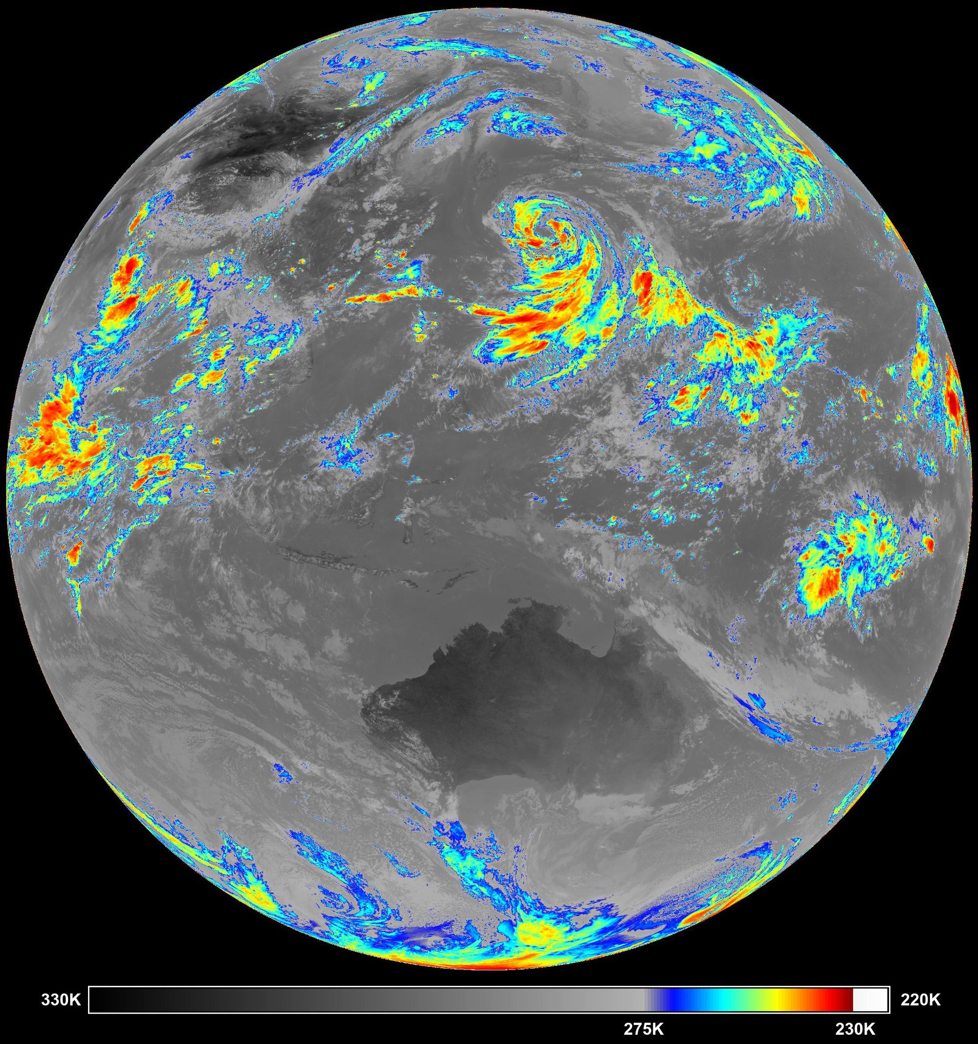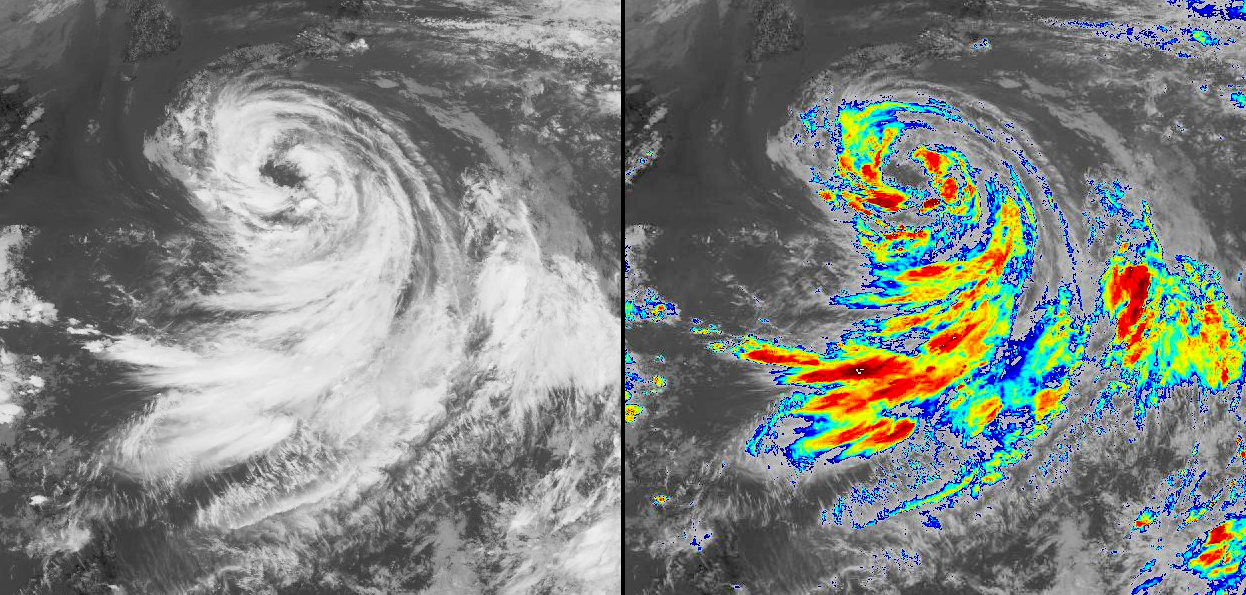 In typical thermal infrared imagery the brightness increases as temperature decreases, meaning the strongest (coldest) weather systems appear the brightest. Much of the detail in the above imagery of Typhoon Krosa is washed out near the eye of the system (coldest area). A considerable amount of detail is revealed after colour enhancement of the brighter regions.