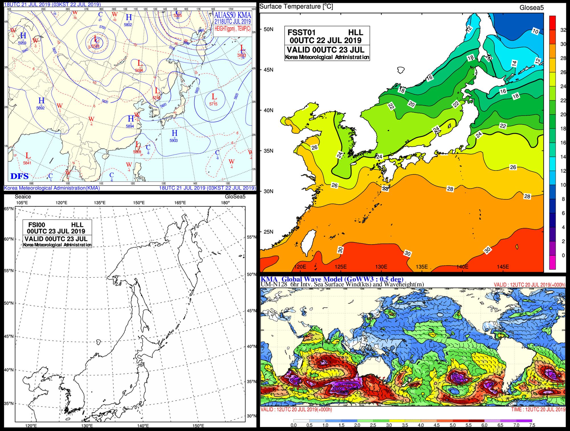 Images not directly derived from GK-2A sensor data are also transmitted between full disk images. These include synoptic charts (surface pressure), sea temperature charts, swell forecasts and sea ice maps.