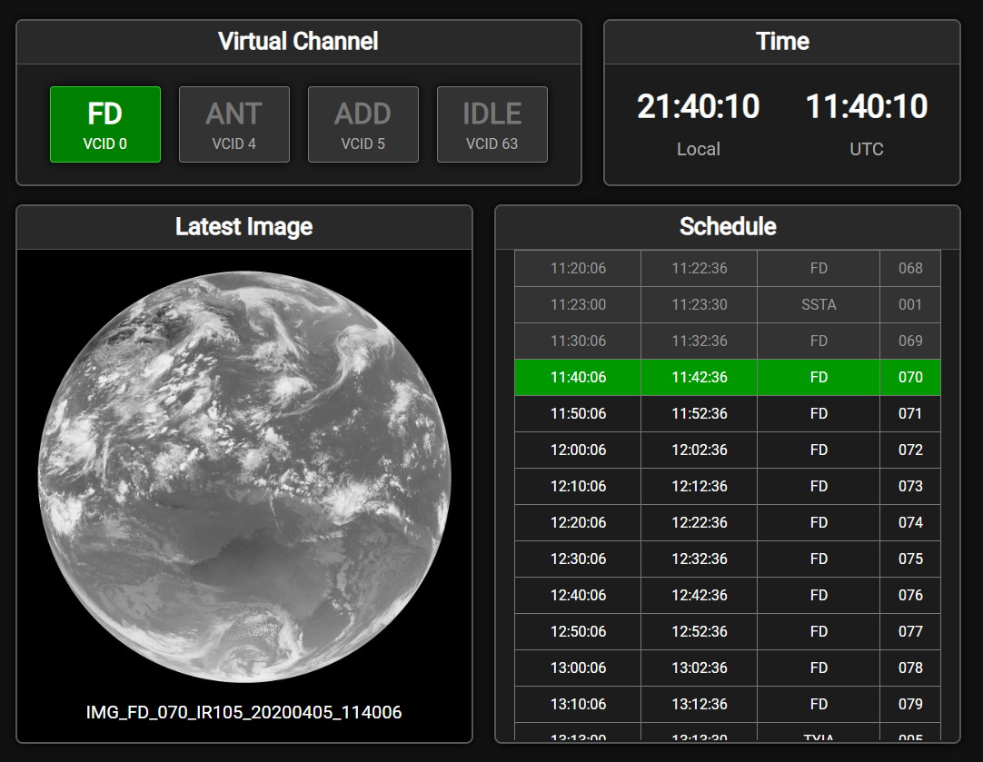 Included in xrit-rx is a web-based monitoring dashboard for convenient monitoring of the decoder and viewing of received data. It also displays the LRIT transmission schedule which is downloaded from the KMA website when the dashboard is loaded.