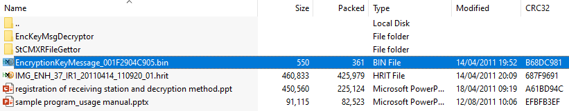 This Encryption Key Message file itself is encrypted and needs to be decrypted before use. The second part of the file name is the decryption key for this file: EncryptionKeyMessage_001F2904C905.bin. The keymsg-decrypt.py script in the xrit-rx "tools" folder can decrypt this file and will output the plain-text keys to a new file called EncryptionKeyMessage.bin.