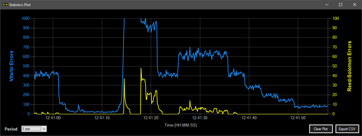 goesrecv monitor can plot the Viterbi and Reed-Solomon error counts in real-time using the Statistics Plot window. The plot has selectable time ranges from 1 minute up to 24 hours. Plot data can be exported to a CSV file using the "Export CSV" button on the lower right of the window.