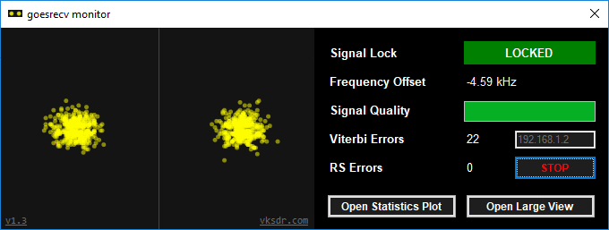 Finally, run goesrecv-monitor.exe and enter the IP address of a device running goesrecv, then click Connect (or hit enter). The constellation plot and statistics list will start showing data.