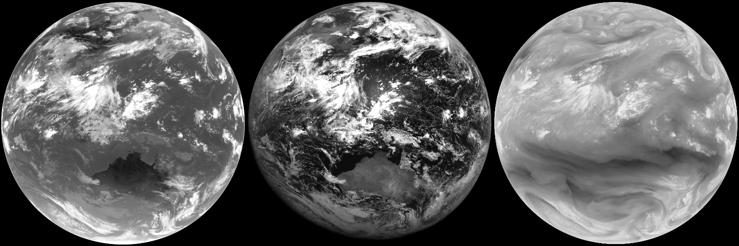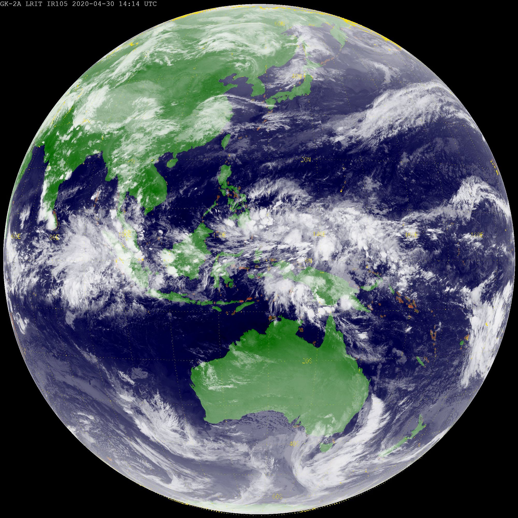 Colour weather satellite imagery requires multiple channels (wavelengths) of data to be combined into one image which is called a false-colour image. Since only one infrared channel is transmitted via GK-2A LRIT we have to compromise by using artificial images in place of the missing wavelengths.