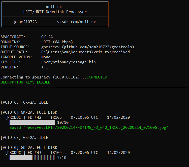 xrit-rx will connect to goesrecv at the IP address specified in the configuration file and begin receiving packets. Within a few minutes an image will be received from GK-2A and saved to the received folder inside the xrit-rx folder.